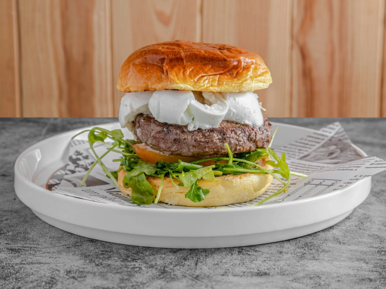 Ternera premium 160g, mozzarella de búfala cremosa, tomate en rodajas, rúcula fresca y salsa de albahaca.