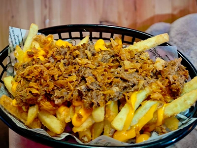 Patatas fritas cubiertas con pulled pork jugoso, queso cheddar fundido y cebolla crispy.