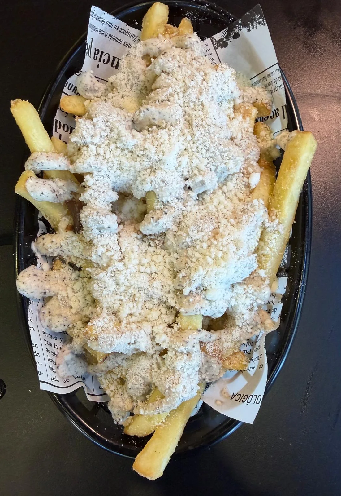 Patatas fritas acompañadas de nuestra mayonesa de trufa casera y queso parmesano rayado.
