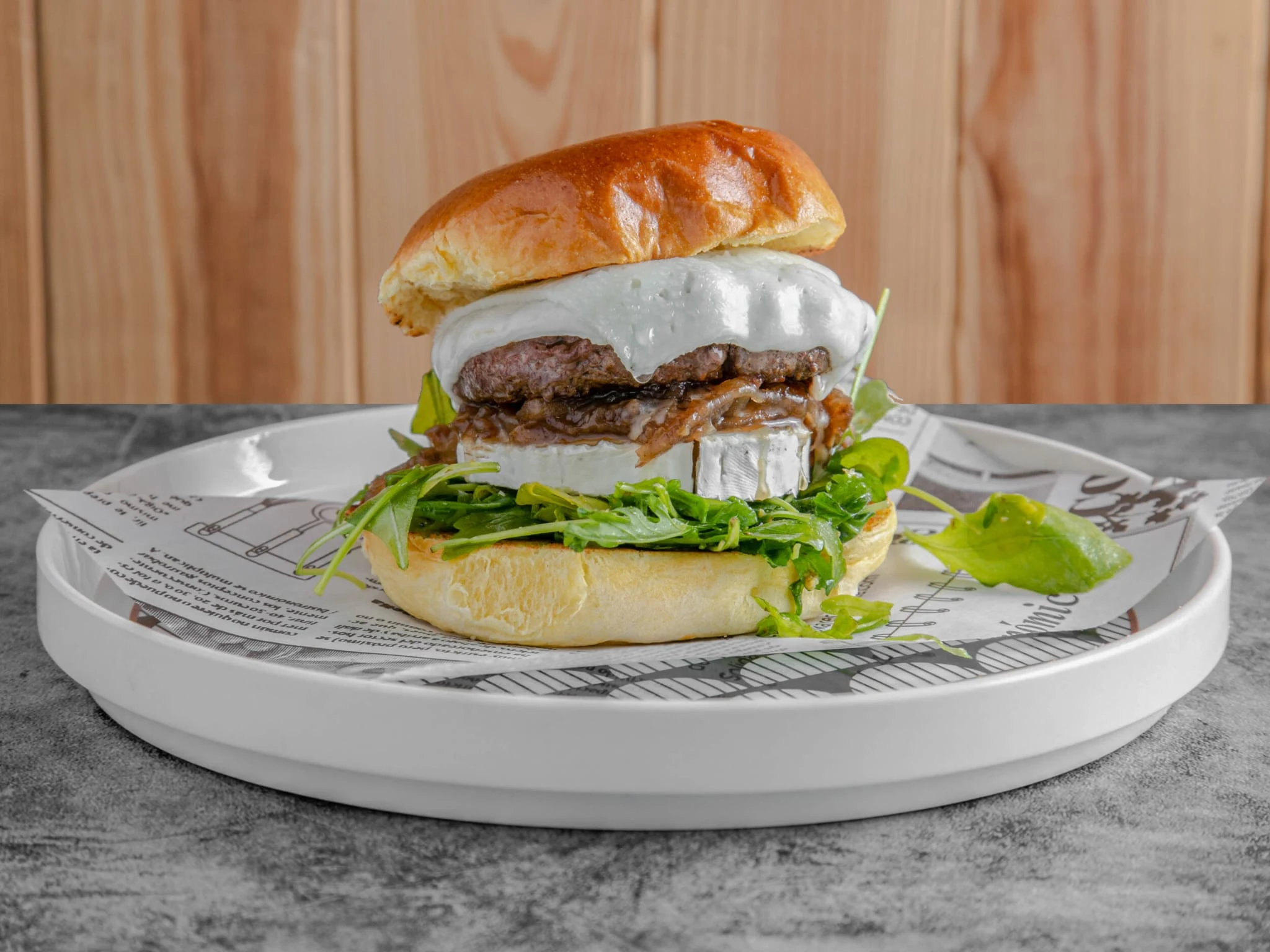 Ternera premium 160g, queso de cabra suave, rúcula fresca, cebolla caramelizada en su punto